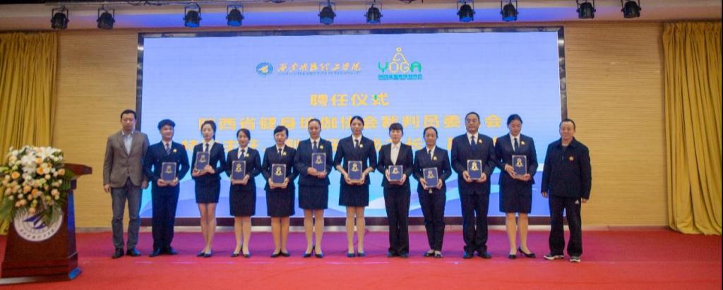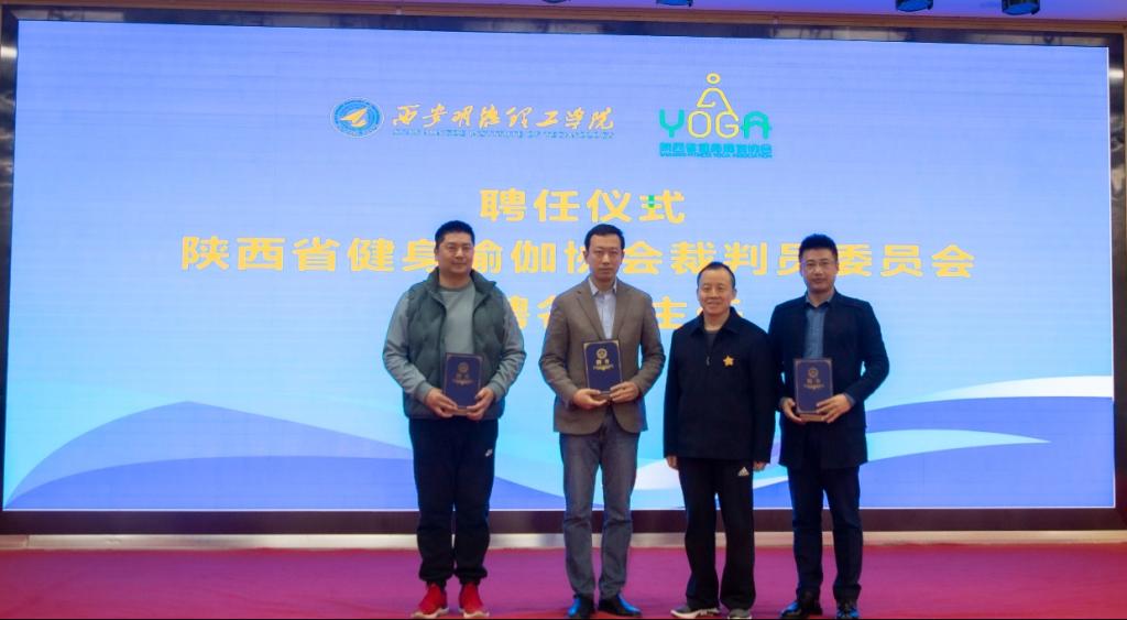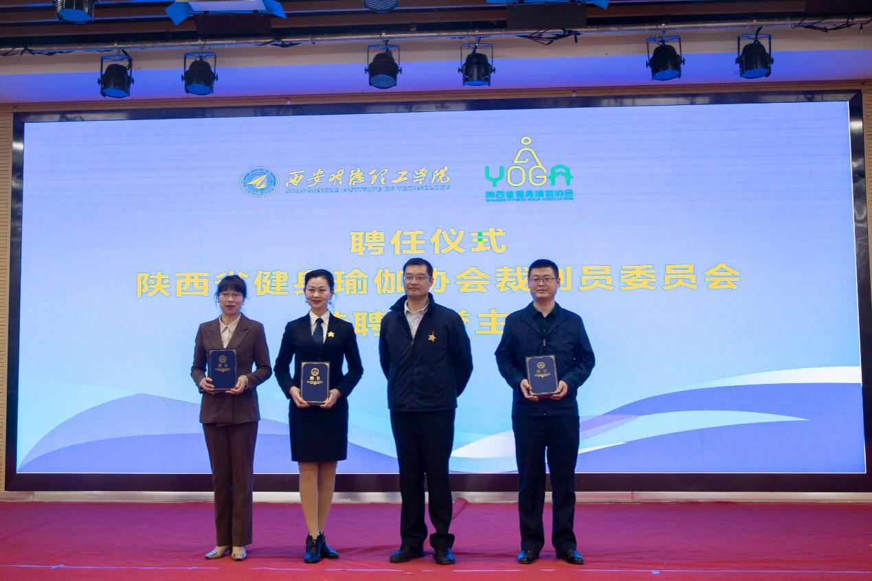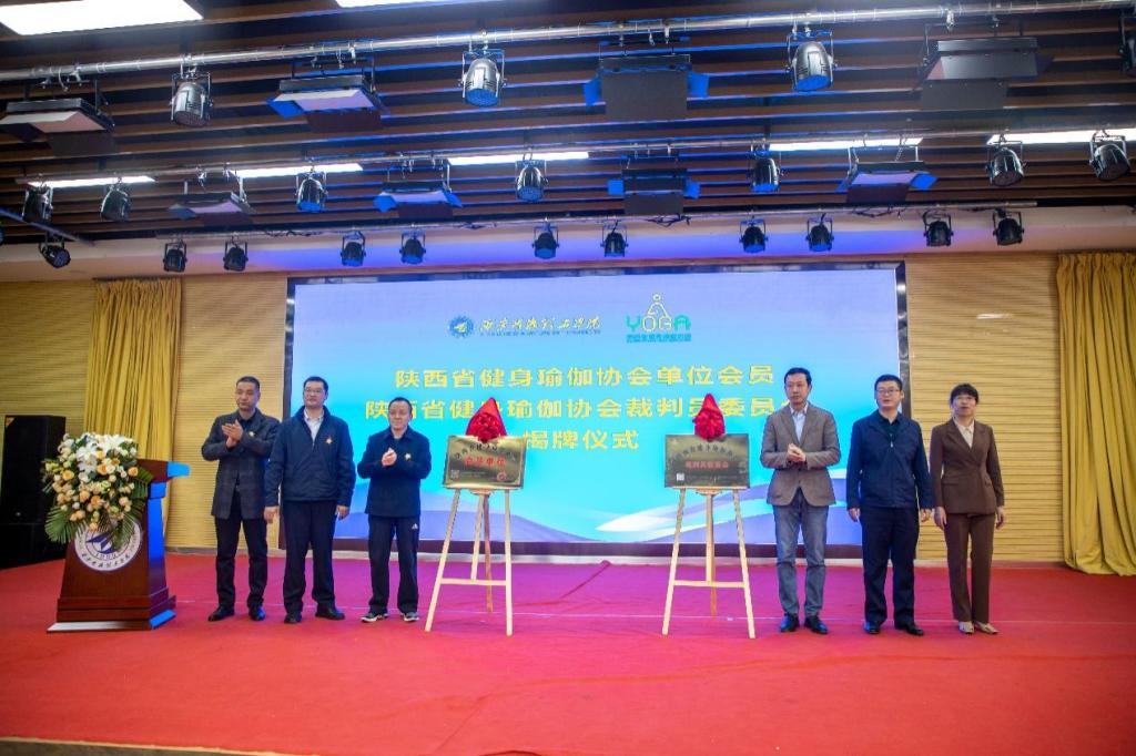 陕西省健身瑜伽协会主席金新刚、党支部书记郭飙、副主席孟周焕与西安明德理工学院党委副书记董昊、马克思主义学院与通识教育学院党委书记王君涛、识教育学院副院长郑薇共同为“陕西省健身瑜伽协会单位会员”“陕西省健身瑜伽协会裁判员委员会”揭牌,并将裁判员委员会挂靠西安明德理工学院。