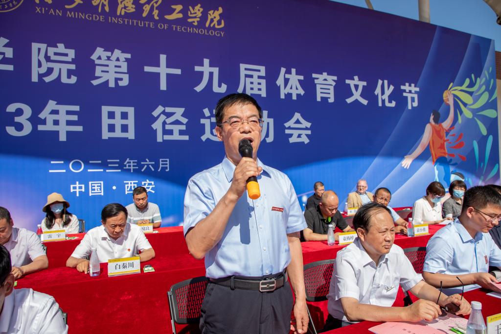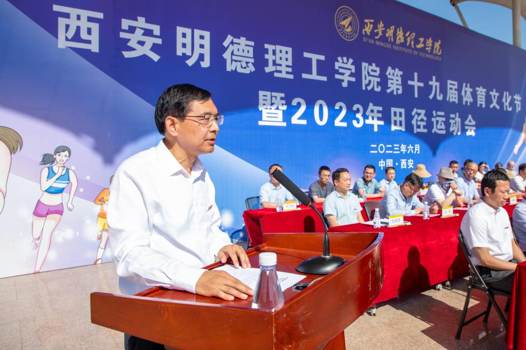 阎东明书记宣布西安明德理工学院第十九届体育文化节暨2023年田径运动会开幕。