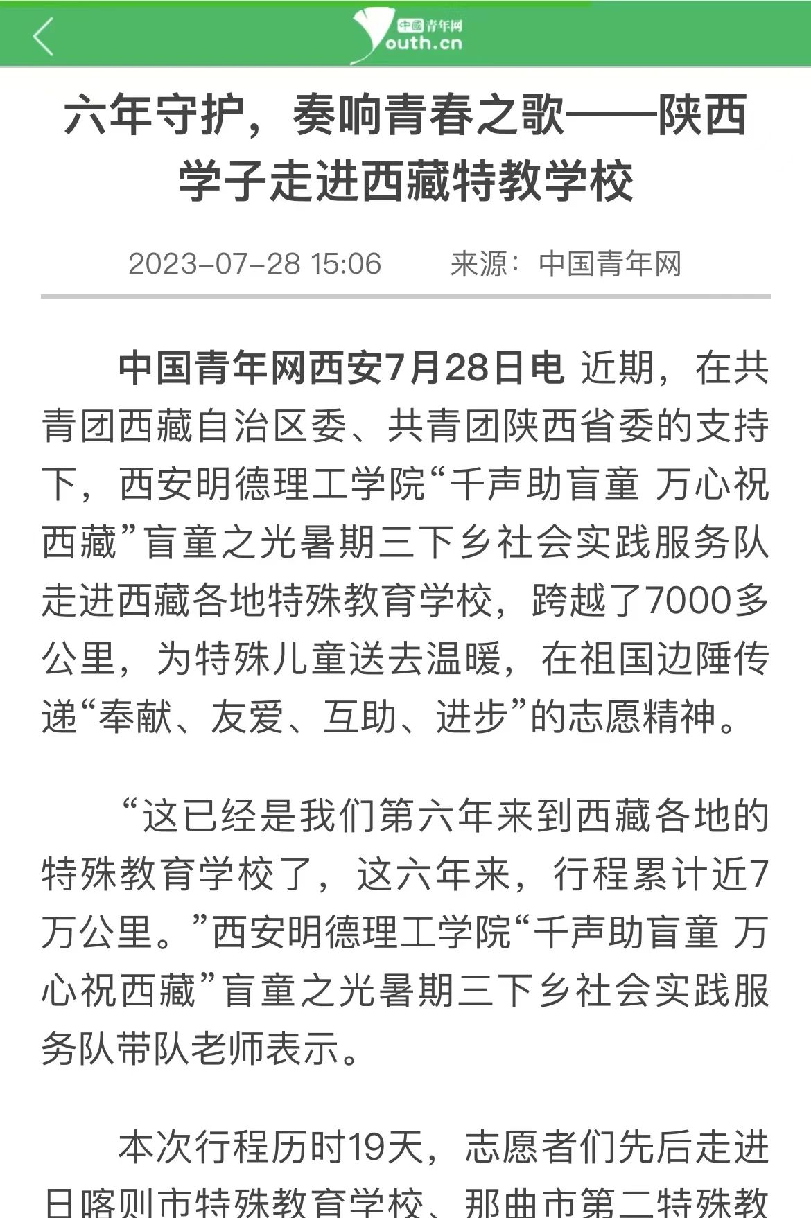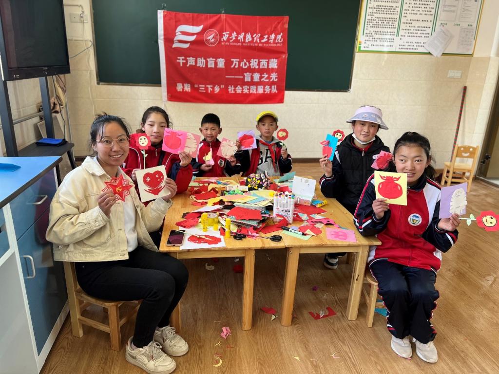 阳光助残风雨六年,民族团结繁花盛开。在西藏自治区团委、共青团陕西省委的大力支持下,西安明德理工学院党委的关怀下,西安明德理工学院“千声助盲童万心祝西藏”盲童之光暑期三下乡社会实践服务队秉持初心,风雨无阻,连续6年走进西藏各地特殊教育学校,践行民族团结政策,情系藏区盲童,在日喀则市特殊教育学校、那曲市第二特殊教育学校、昌都市特殊教育学校、拉萨市特殊教育学校、山南市特殊教育学校、林芝市特殊教育学校等6所学校捐赠“声音图书馆”、“盲童听书室”,累计开展支教活动共9次,服务残障儿童近千人,累计行程近7万公里,累计捐赠爱心物品超20万,并为西藏各特殊教育学校送教上门,开展《铸牢中华民族共同体意识宣讲》《习近平法治思想宣讲》《教师礼仪与沟通艺术》《特教教师的自我成长与心理解压》、《手机摄影与生活哲学》、《儿童律动训练》、《盲人按摩实操》等精品课程。