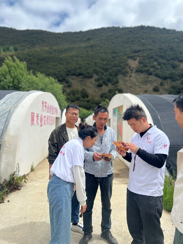 与此同时,为进一步展示青春力量,助力乡村振兴,志愿者团队在巴河镇干部赵星的引领之下,先后走进巴河镇连巴村红颜草莓采摘示范园拍摄宣传照片并直播带货助力村民售卖高原草莓;实地参观调研了具有藏区特产代表性的简易养蜂“基地”、灵芝、贝母等中草药种植基地、藏香猪火腿生产基地等当地特色产业机基地,实地调研产品研发、技术需求、销售途径等情况,在“党旗红 产业兴 聚合力 促发展”的战略和科技助农的带动下,以特色产业促经济发展,为雪域高原之上,蓝天白云之下的巴河镇更添活力。