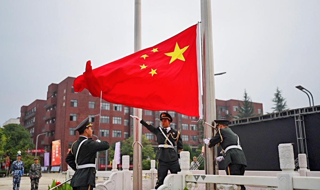 6时40分,国旗护卫队步伐坚定,护送国旗至升旗台。伴随着庄严雄壮的国歌,军训团全体成员面向国旗肃立、行注目礼。