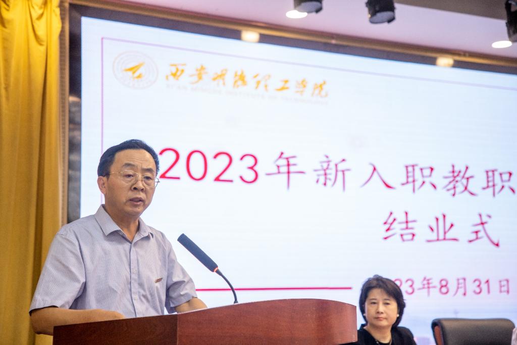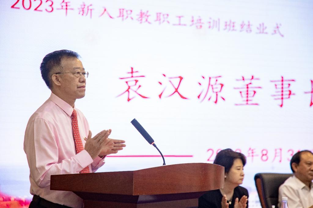 袁汉源董事长发表了热情洋溢的讲话。他对新加入明德大家庭的各位新教职工表示热烈欢迎。他首先介绍了学校的发展历程和取得的辉煌成就。他表示,金叶科教集团将着力提升教育事业在集团产业布局中的地位,切实履行投资人职责,充分发挥自身优势,为学校在基本建设投资及教育教学事业投入方面提供稳定、可靠的资金保障,将西安明德理工学院打造成金叶科教集团教育产业“旗舰店”。同时,他提出三点希望:一是要凝心铸魂,坚守为党育人、为国育才的初心使命,落实立德树人根本任务,用最佳实践去回答培养什么人、怎样培养人、为谁培养人这一根本问题。二是要引才聚才,学校瞄准国家重大战略需求,紧扣高质量发展主题主线,积极推进精准引才、系统育才、科学用才、用心留才,打造人才集聚之地、人才辈出之地、人才创业之地、人才向往之地,在教育强国建设中突显西安明德理工学院担当作为。三是要共同奋斗,大家要传承金叶集团30年来团结务实进取思变的优良作风,践行纳百川成海业,思进取赢未来的核心文化价值理念,传承西北工业大学公诚勇毅的优秀文化,艰苦创业、矢志奋斗。他强调,新征程是充满光荣和梦想的远征,学校要全面贯彻落实党的二十大精神,增强信念信心、坚定底气锐气,超前布局、准确识变、科学应变、主动求变,跳出教育看教育、立足全局看教育、放眼长远看教育,加强统筹谋划提升领导力,聚焦根本任务提升执行力,实施目标牵引提升竞争力,坚持人才强校提升战斗力,优化工作氛围提升向心力,在高质量发展中开辟新领域新赛道,做人无我有的开创者、人有我优的领跑者,为把学校建设成为特色鲜明、国内一流具有一定国际知名度的应用型大学而共同奋斗!