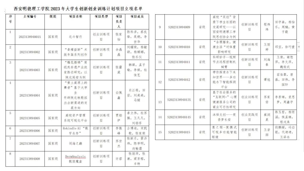 近日,在陕西省教育厅公布的2023年大学生创新创业训练计划项目评选结果中,我校共有68项大学生创新创业训练计划项目立项,其中“北斗智行”等8个项目获国家级推荐,“高校双创背景下学生社团的发展研究——以西安明德理工学院思创协会为例”等60个项目获省级立项,获批立项数量创历年新高。