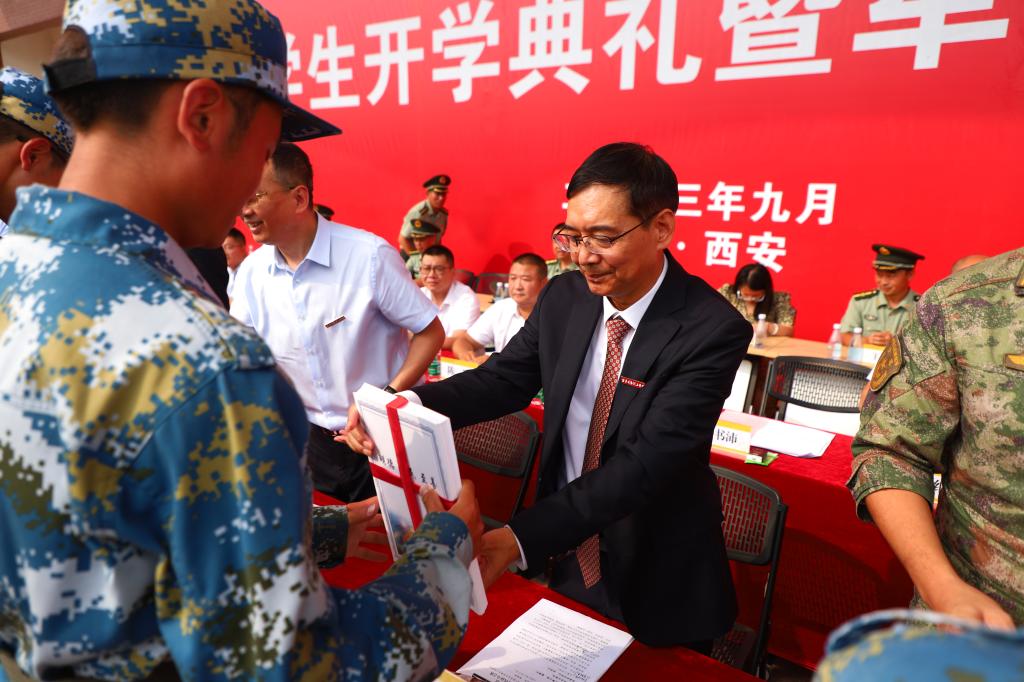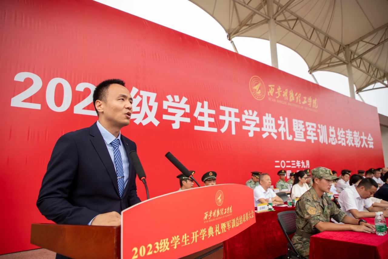 9月9日上午,西安明德理工学院2023级学生开学典礼暨军训总结表彰大会在学校运动场隆重举行,陕西金叶科教集团董事局主席、总裁,西安明德理工学院董事长袁汉源、校长杨健君、党委书记阎东明、空军某旅上校副旅长贾向阳及陕西金叶科教集团领导、明德源教育集团领导、学校全体校领导出席典礼。学校各单位负责人、教师代表、新生家长代表以及学生军训团全体人员参加典礼。开学典礼由学校党委副书记董昊主持。