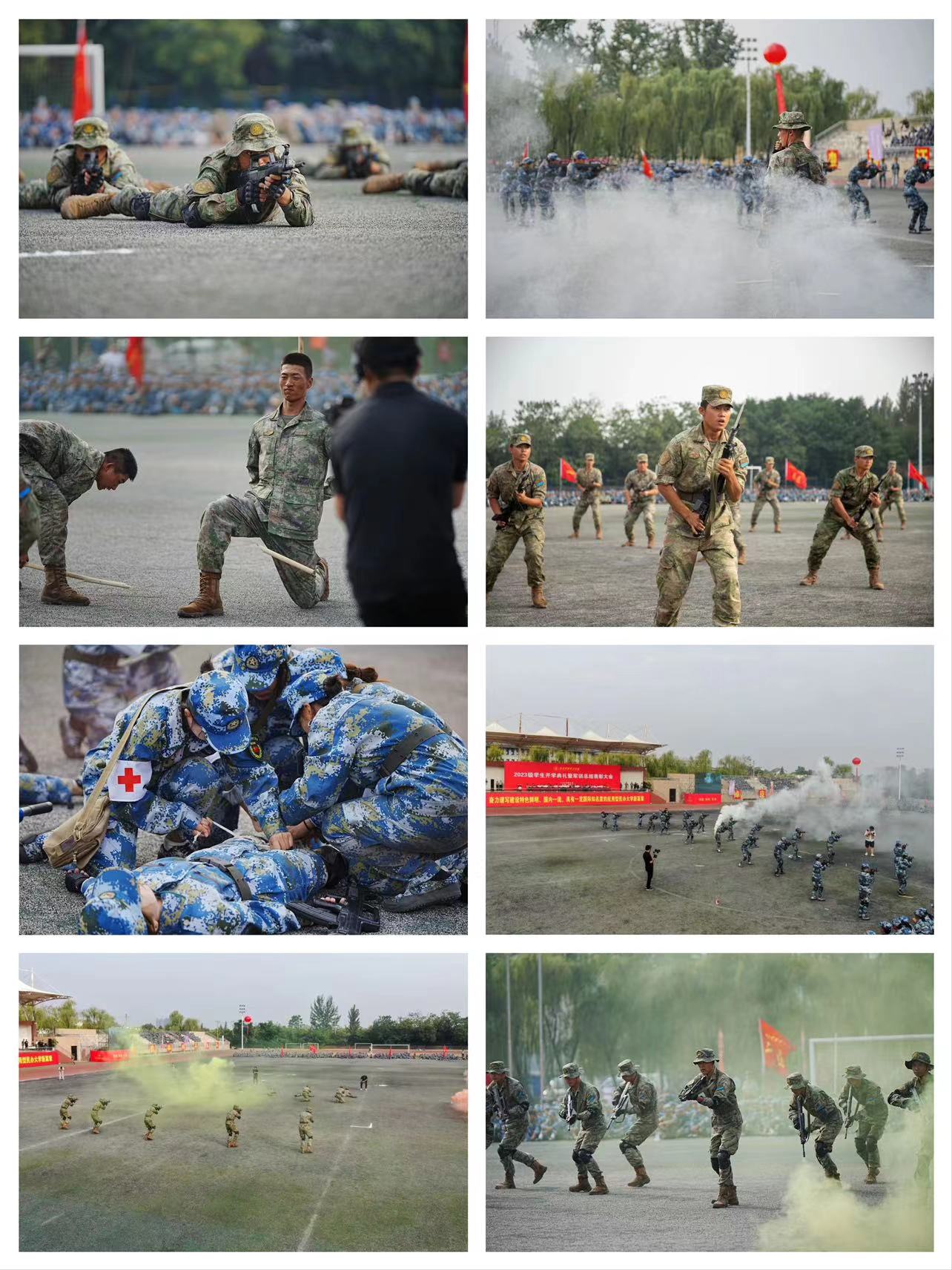 随后,军训团进行了刺杀操、军体拳、战术组合、花样队形等军事科目汇报展示。