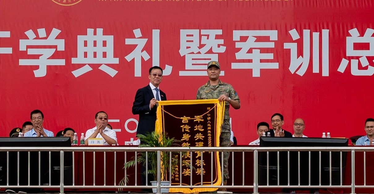 西安明德理工学院董事长袁汉源为承训单位空军某旅赠送锦旗。