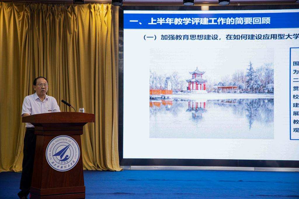 校长杨健君作了题为“踔厉奋发,务实笃行,推动年度工作目标任务圆满完成”的讲话,充分肯定了学校暑期各项工作,分析了当前面临的形势任务和存在的问题不足,明确了秋季学期学校工作思路,并对重点工作作了部署。杨健君指出,新学期工作,要坚持教学评建工作一条主线,深化教育教学改革、体制机制改革“两项改革”,推进强师工程、凝聚力工程、和谐校园建设工程“三大工程”,开好人才工作会、思政工作会、教学工作会、实践教学工作会、学风建设工作会“五个会议”。他强调,要突出做好五项重点工作,一是要扎实做好党建工作,切实提供坚强保证;二是要围绕教学评建主线,统筹推进达标建设;三是要加快治理体系改革,不断激发办学活力;四是要深化人事制度改革,推进实施强师工程;五是要常态排查整治风险隐患,全力保障校园安全稳定。他强调,广大教职员工要以干事创业的精神谋事干事,要以攻坚克难的决心担当作为,要以严谨务实的作风实干笃行,始终以永不懈怠的精神状态和一往无前的奋斗姿态,圆满完成年度工作任务,顺利实现评建工作目标,为建设特色鲜明、国内一流、具有一定国际知名度的应用型大学而持续奋斗!