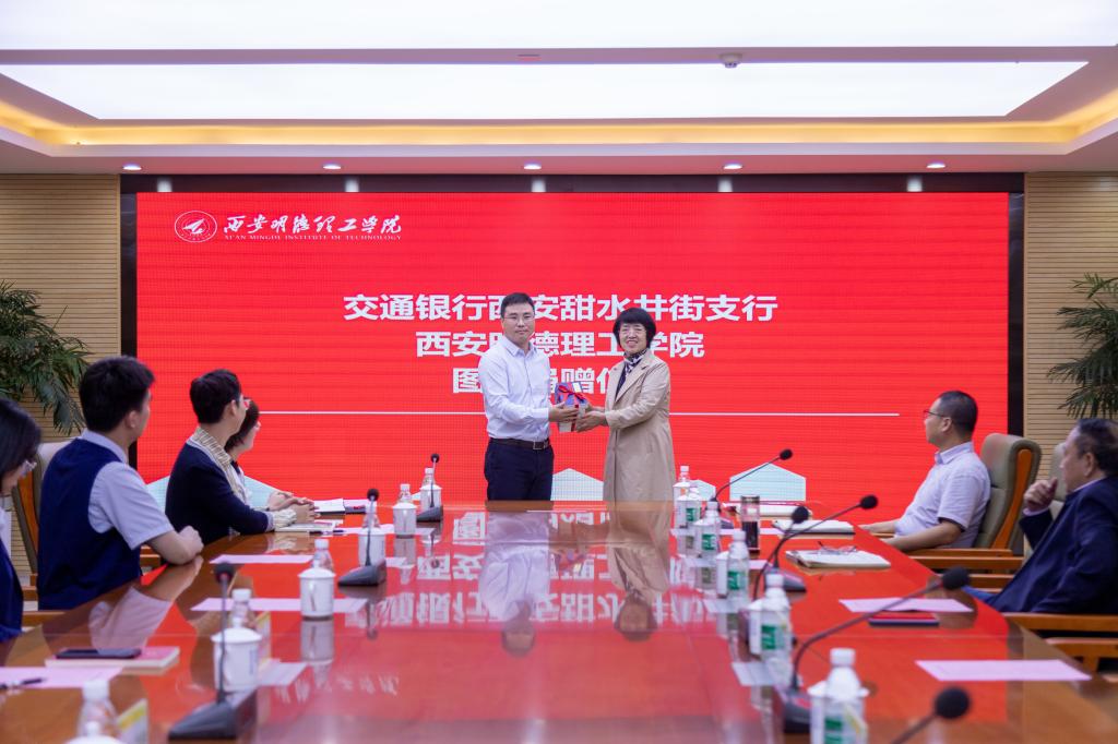 “腹有诗书气自华,最是书香能致远”,9月27日上午,交通银行西安甜水井街支行向我校捐赠图书近7000册,捐赠仪式在明志楼518会议室隆重举行。交通银行甜水井街支行行长孙磊、营业室主任陈易达等一行四人与学校常务副校长王志刚、财务总监马晓军及各职能部门负责人参加了会议。会议由图书馆馆长王爱霞主持。