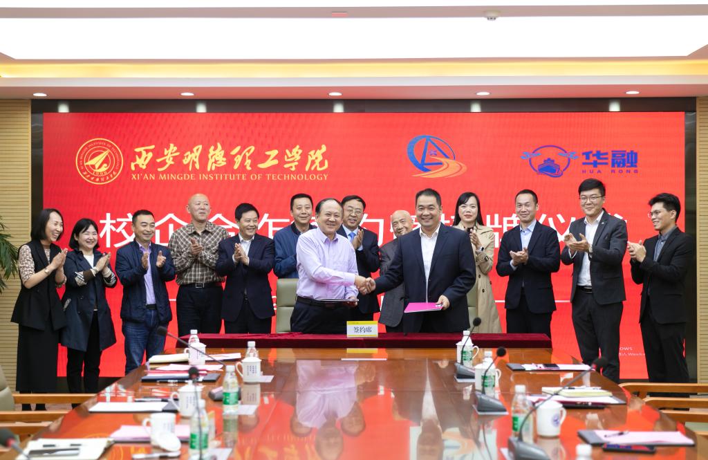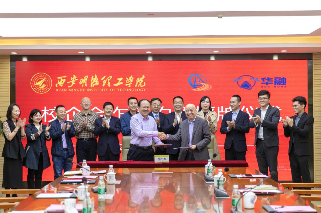在与会人员的见证下,西安明德理工学院校长王志刚与粤港澳大湾区经济产业研究联合会理事长、广东省华融产业研究院院长梁松寿,粤港澳大湾区经济产业研究联合会陕西分会理事长李明富共同签署合作协议。