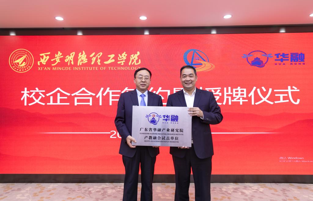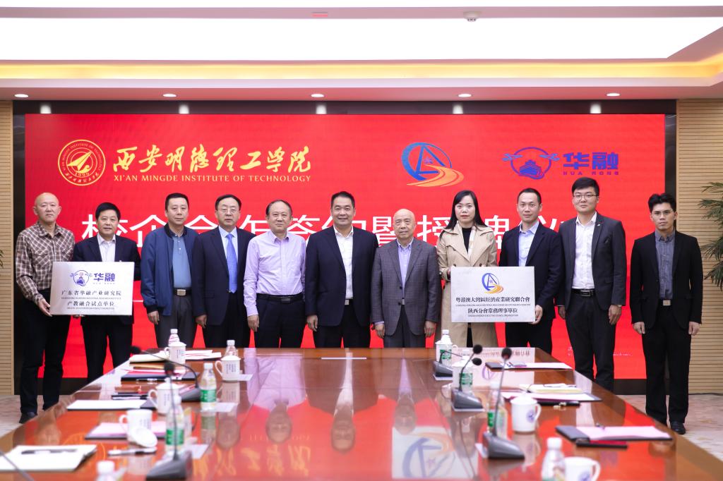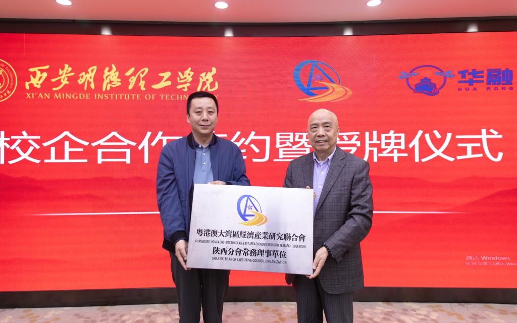 粤港澳大湾区经济产业研究联合会理事长、广东省华融产业研究院院长梁松寿,粤港澳大湾区经济产业研究联合会陕西分会理事长李明富分别向我校授牌:粤港澳大湾区经济产业研究联合会陕西分会常务理事单位、广东省华融产业研究院产教融合试点单位。副校长白秦川、财务总监马晓军代表我校接牌。