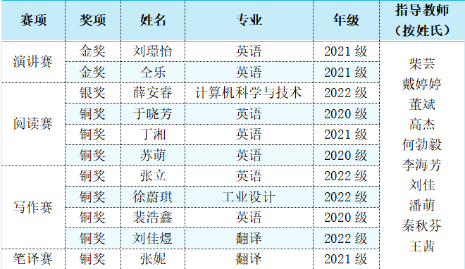 10月28日, 2023“外研社·国才杯”“理解当代中国”全国大学生外语能力大赛演讲、阅读、写作、笔译四个赛项的陕西省赛区决赛在西安外国语大学长安校区顺利举行。我校选手共获金奖2项、银奖1项、铜奖8项,成果丰硕。其中,2021级英语专业刘璟怡、仝乐同学以演讲赛前十名的优异成绩荣获陕西省赛区金奖,双双突围并晋级国赛,再次刷新我校该项赛事上的最佳记录,使我校成为本届演讲赛陕西省赛区唯一一所拥有两项金奖的民办高校。2022级计算机科学与技术专业薛安睿同学获阅读赛银奖,是非英语专业学生在该赛事上取得的突破性成绩。