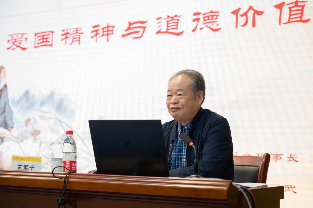 报告会上,苏振武教授以《苏武精神与道德价值》为主题,分别从苏武事迹、苏武人格风范与精神实质、苏武精神的文化传承与贡献、苏武精神的历史影响和现代价值等四个方面,为在场师生解读了苏武不凡的一生。苏教授以宏大的视野讲述了苏武受汉武帝之命出使匈奴,而后受尽磨难,却宁死不屈、志向不变,令后人钦佩。报告会以鲜明独特的历史文化,刻画了苏武凄美气节与高大形象,印证了中华民族磅礴精神气概。苏教授讲到,苏武的爱国精神已经熔铸为中华民族的魂魄,苏武的民族气节已经撑起了中华民族的脊梁,苏武的名字已经成为中华爱国主义的道德符号。他指出苏武精神的实质就是爱国主义民族精神!经过两千多年的历史传承,苏武的事迹已经家喻户晓,已经形成了一种独特的苏武文化。