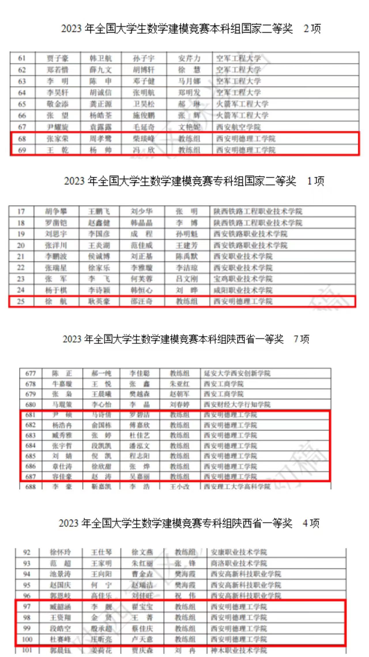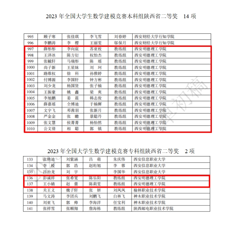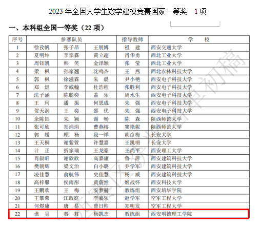 近日,2023年高教社杯全国大学生数学建模竞赛(CUMCM)成绩揭晓。经过激烈角逐,我校共获得本科组国家一等奖1项,国家二等奖2项,陕西赛区省一等奖7项,二等奖14项;专科组国家二等奖1项,陕西赛区省一等奖4项,二等奖2项,并蝉联陕西赛区优秀组织奖,李妮老师被评为陕西赛区优秀指导教师。
