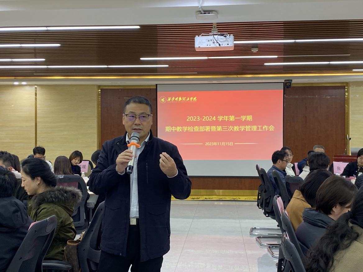 为规范教学过程管理,强化教学质量监控,加强教学过程监督以及后半学期教学工作的进一步顺利开展,11月15日下午,学校组织召开了2023-2024学年第一学期期中教学检查部署暨第三次教学管理工作会议,副校长朱延波、各二级学院主管教学副院长、办公室主任、教务人员、质量管理与评估办公室、教师发展中心、党委学生工作部负责人和教务处相关人员等一百余人参加了会议。会议由教务处副处长文亮主持。