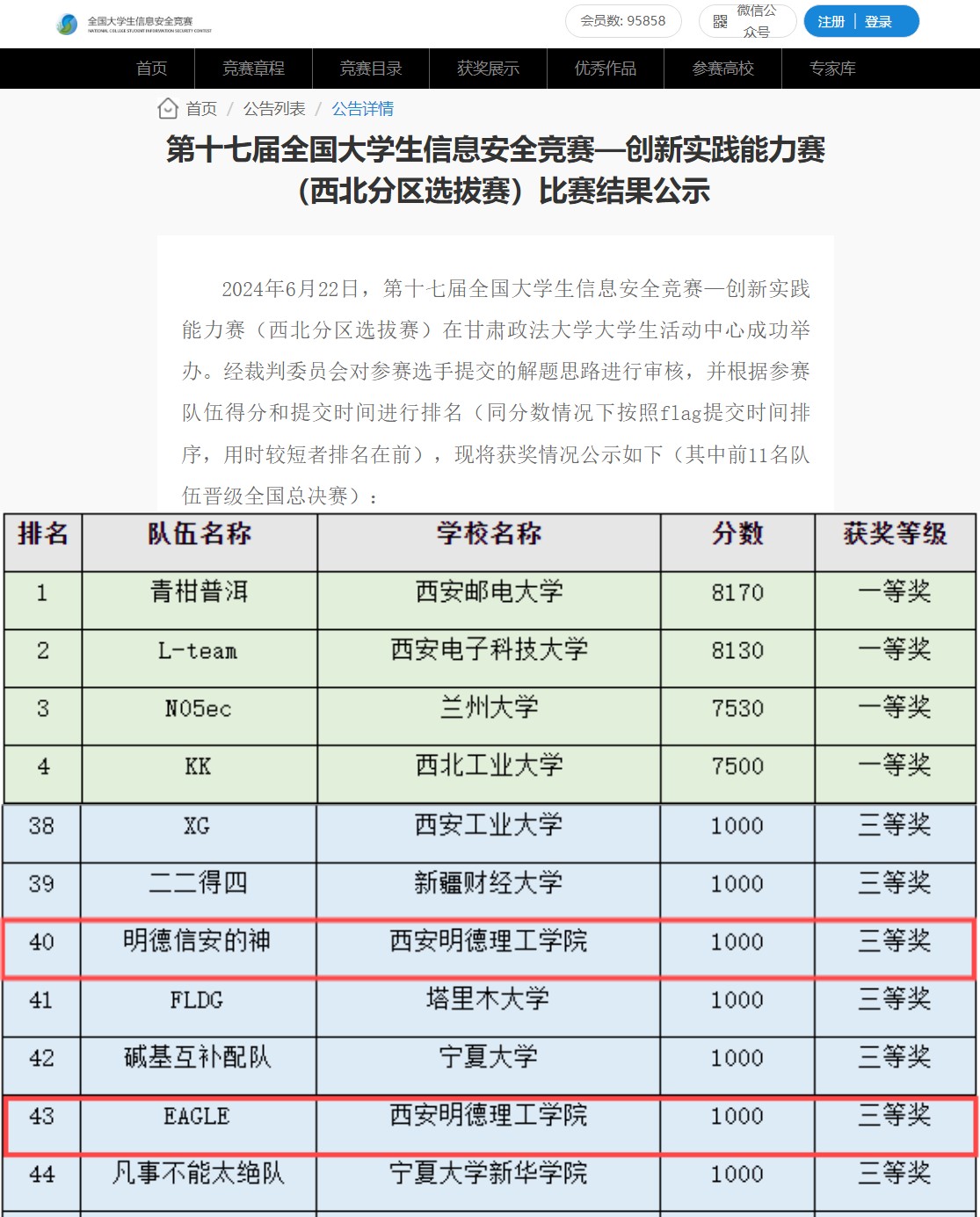 2024年6月22日,第十七届全国大学生信息安全竞赛创新实践能力赛(西北分区选拔赛)在甘肃政法大学(安宁校区)体育馆成功举行。本次大赛由教育部高等学校网络空间安全专业教学指导委员会主办,由甘肃政法大学承办,甘肃省网络空间安全创新人才培养基地、兰州市网络安全宣传教育基地协办,中网信安科技有限公司提供技术支持。由我校信息工程学院李茹、段林老师带领的网络安全初创团队参加竞赛。团队凭借出色的实力和默契的配合,在众多参赛队伍中脱颖而出,不仅成功在初赛中取得了西北赛区第八名的佳绩,更是在分区决赛中,经过6个小时的激烈角逐,取得西北分区三等奖。
