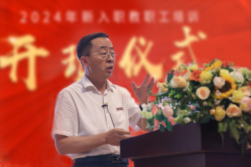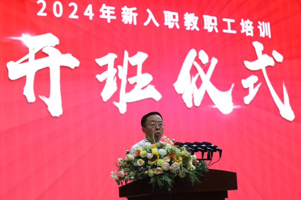 新入职教职工培训开班仪式在雄壮的《中华人民共和国国歌》声中开幕;西安明德理工学院副书记、副校长白秦川介绍2024年新入职教职工培训目的及意义。他代表学校对各位新同事的到来表示热烈欢迎和最诚挚的问候!同时对参会的领导表示感谢。