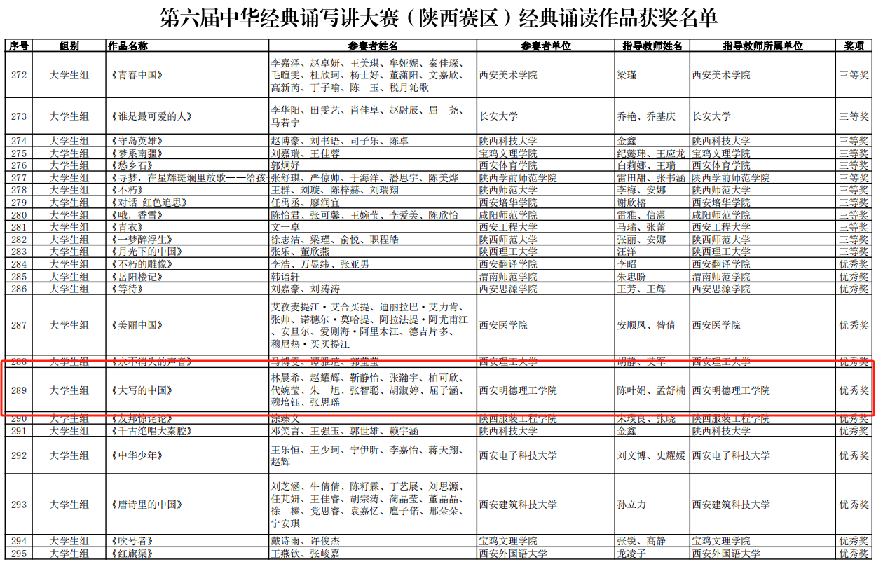9月12日,陕西省教育厅办公室公布了第六届中华经典诵写讲大赛陕西赛区获奖结果。我校师生在本次大赛中荣获佳绩。我校孟舒楠教师的参赛作品《诗意中国》获得教师组三等奖,林晨希等学生的参赛作品《大写的中国》获得大学生组优秀奖。