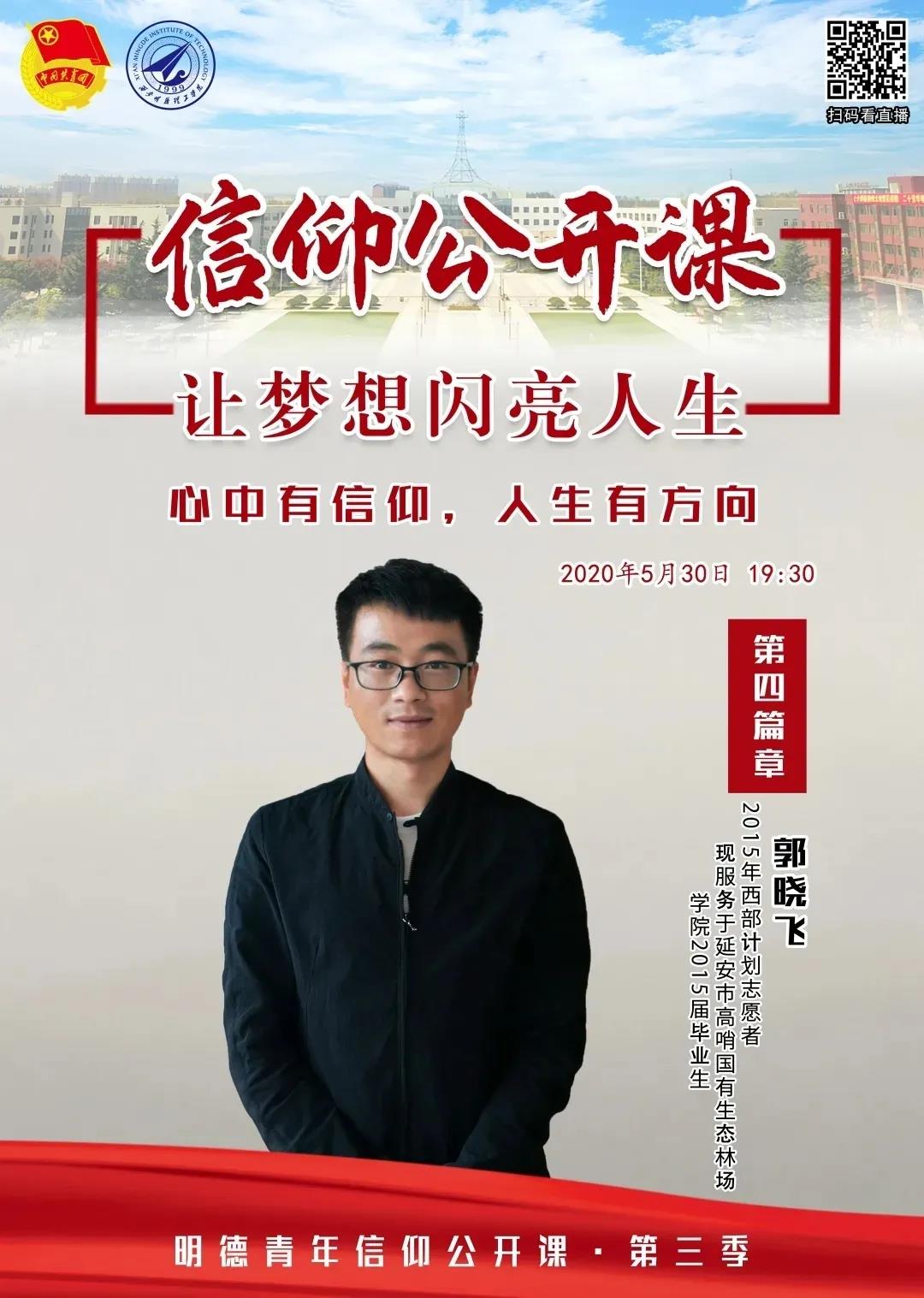 5月30日下午,2020“明德青年·信仰公开课”第三季第四篇章“心中有信仰,人生有希望”准时开讲,本期的主讲嘉宾为2015年西部计划志愿者、学院2015届毕业生郭晓飞。