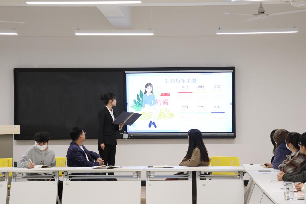 会议伊始,学生会文体部朱晨萱从“3·15”的由来、主题、大学生常见侵权类型以及学生如何维权等四个方面进行了分享。