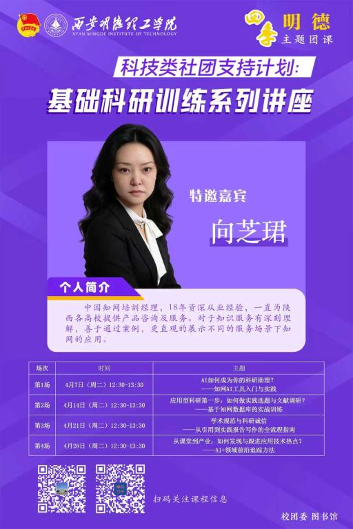 为深入贯彻党的教育方针,全面落实立德树人根本任务,在迎接学校本科教学工作合格评估的关键时期,积极响应国家关于“深化创新创业教育改革”的号召,紧跟人工智能时代发展的步伐,提升同学们的科研素养与数字化能力,以先进的技术手段赋能学术创新,营造积极向上、勤学奋进的“学在明德”浓厚氛围,学校举办本次“四季明德”主题团课——科技类社团支持计划:基础科研训练系列讲座。本次系列讲座经过校团委与图书馆的精心筹备,特邀中国知网资深培训经理向芝珺老师担任主讲,首场讲座将为我们分享AI工具在科研中的应用技巧,传递科技赋能学术的信仰力量。