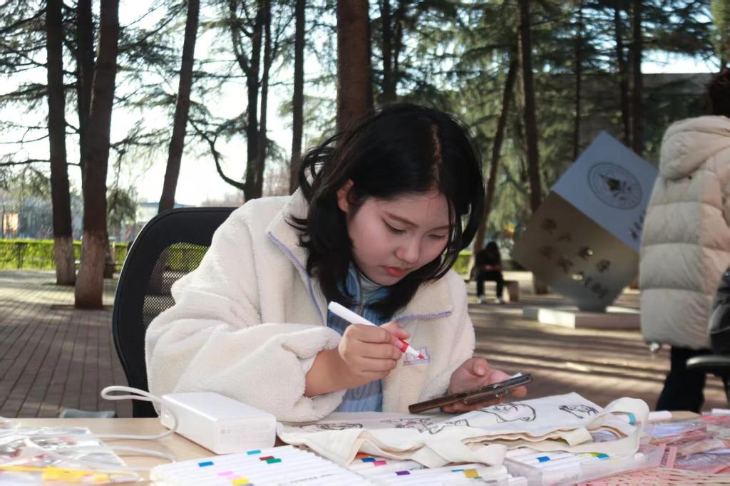 在芳菲林片区,美育实践与传统文化交融共生。书画协会以林为展,现场挥毫创作“明德、亲民、至善”等作品,将汉字之美与自然之景相融,让学生在墨韵中感受笔端流淌的艺术魅力;“学在明德”优秀笔记主题展与“文明养成”签字墙活动,则将美育与德育紧密融合,引导学生发现学习之美、行为之美。云上电影社设置的石膏娃娃彩绘、传统拓印等体验区,让学生在实践中感受艺术创作的乐趣,提升动手能力与审美素养。