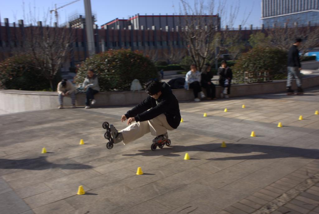下沉广场上,轮滑社与滑板社同场展示,形成一道动感十足的风景线。轮滑社队员们脚踏疾风,以流畅的“S形绕桩”与“交叉滑行”展现精湛技艺;滑板社成员则通过精准的踩踏、腾跃与翻转,在方寸板面上演绎着平衡与创意的完美融合。两个社团各展所长,他们灵动的身影、矫健的姿态,不仅是体育技能的精彩展示,更是青春活力与团队精神的生动诠释,充分响应了“让学生在体育锻炼中享受乐趣、增强体质、健全人格、锤炼意志”的号召。