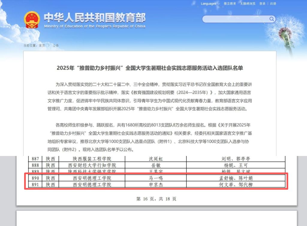 两支队伍成功入选教育部2025年“推普助力乡村振兴”全国大学生暑期社会实践志愿服务活动;