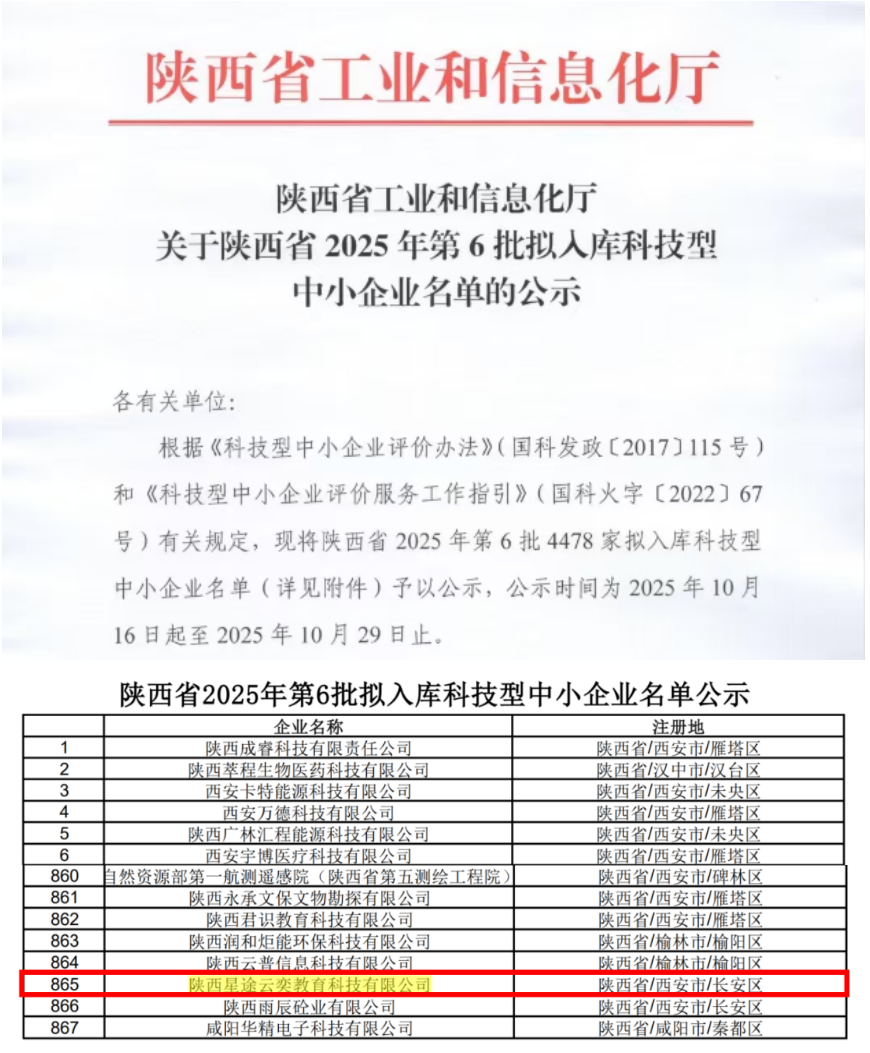 近日,陕西省工业和信息化厅公示2025年第6批拟入库科技型中小企业名单。西安明德理工学院创新创业学院孵化的陕西星途云奕教育科技有限公司成功入选。