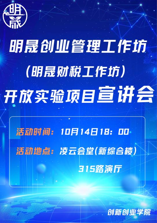 明晟创业管理工作坊(明晟财税工作坊)将于10月14日(星期二)18:00在凌云会堂(新综合楼)315路演厅举行开放实验项目宣讲会。欢迎有意向加入的同学前来,共同探索专创融合与个人能力提升。