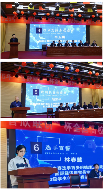 本届大赛技术支持方企业代表辛玉麟先生在讲话中谈到,企业将充分发挥技术优势,为赛事提供全方位支持,助力打造公平、专业的竞技环境。大赛裁判长、山东外国语职业大学商学院院长赵加平教授,西安明德理工学院国际经济与贸易专业学生林春慧先后代表裁判员、参赛学生进行宣誓。