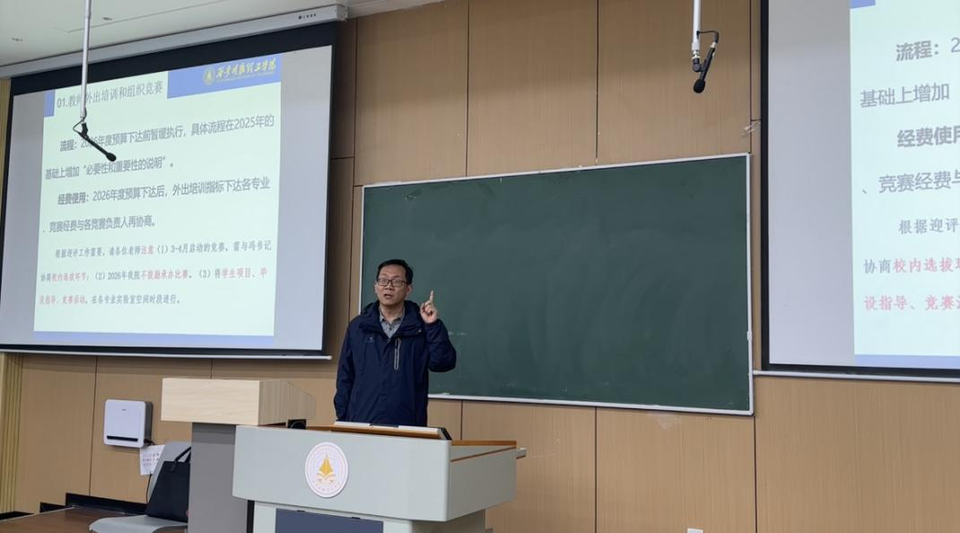 秦东方副院长对学科竞赛组织和2026届毕业论文工作进行了布置和强调,他指出,毕业论文指导教师要高度重视2026届毕业论文工作,严格规范选题、开题、指导、答辩等各环节管理,强化过程监督与质量把控,确保毕业论文工作有序推进、质量过硬,为迎评工作夯实基础。