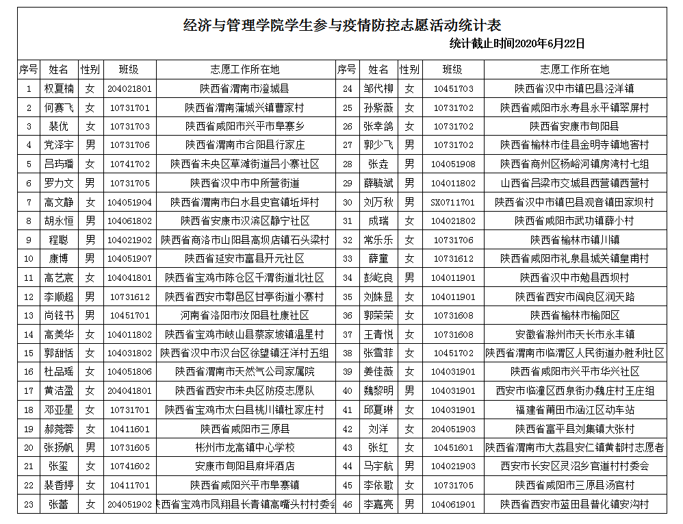 除了以上4名同学,经济与管理学院还有吕玙璠、罗力文等40余名学生在完成线上教学任务后,积极利用课余时间主动投身到了疫情防控一线,以饱满的状态、无私的精神、勤勉的工作成为联防联控、群防群治的重要力量,受到了广大干部群众的高度赞扬。经济与管理学院将以此为契机,大力宣传抗疫志愿者的先进事迹,号召全体同学向他们学习,营造勇于担当的时代风尚,展现当代大学生的优良素质、崇高品格和家国情怀。