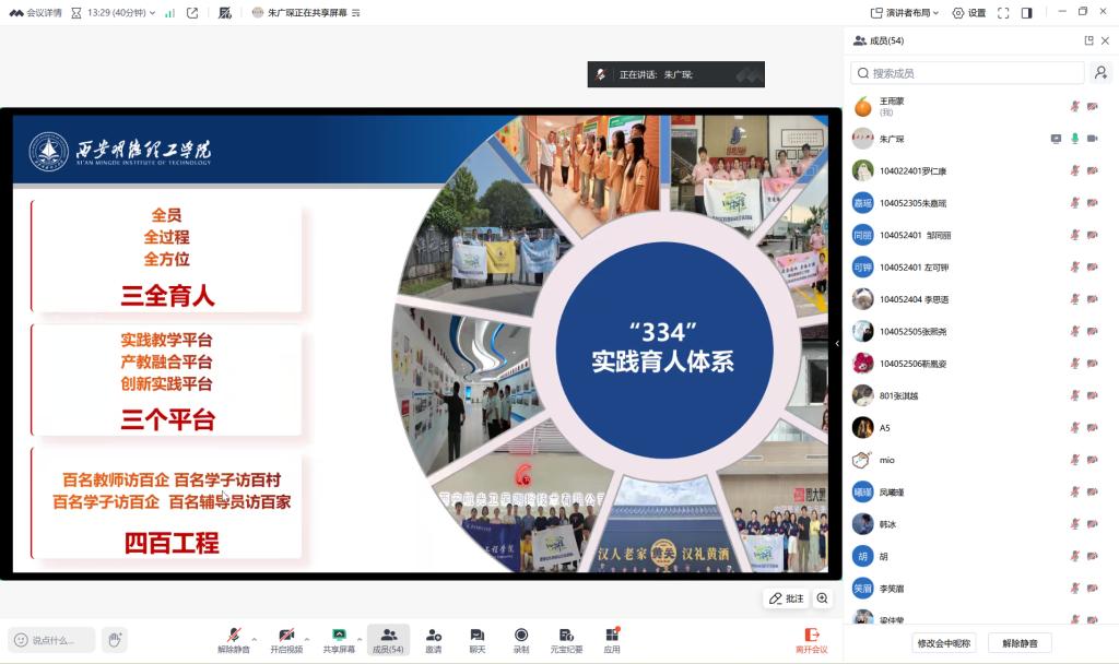 分享会上,学生代表朱广琛作为主讲人,围绕主题进行了深入细致的分享。他首先系统解读了学校构建的“三三四”实践育人体系的内涵与实践路径,随后,他结合自身多次深入基层、服务社会的丰富经历,聚焦“三下乡”社会实践和大学生“返家乡”社会实践活动,分享了自身参与社会实践的经验心得和成长收获,他谈到,参与社会实践不仅是专业知识的检验与拓展,更是对国情民情的深刻认知、对社会责任的自觉体悟、对自身综合能力的全面锤炼。