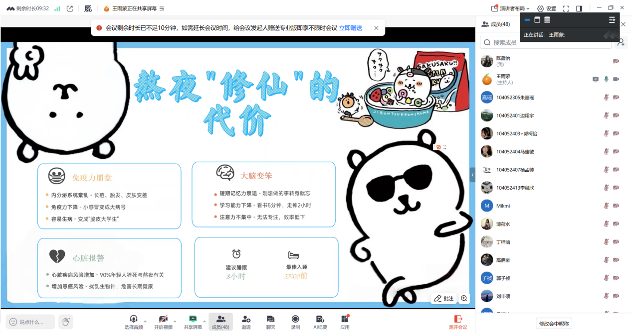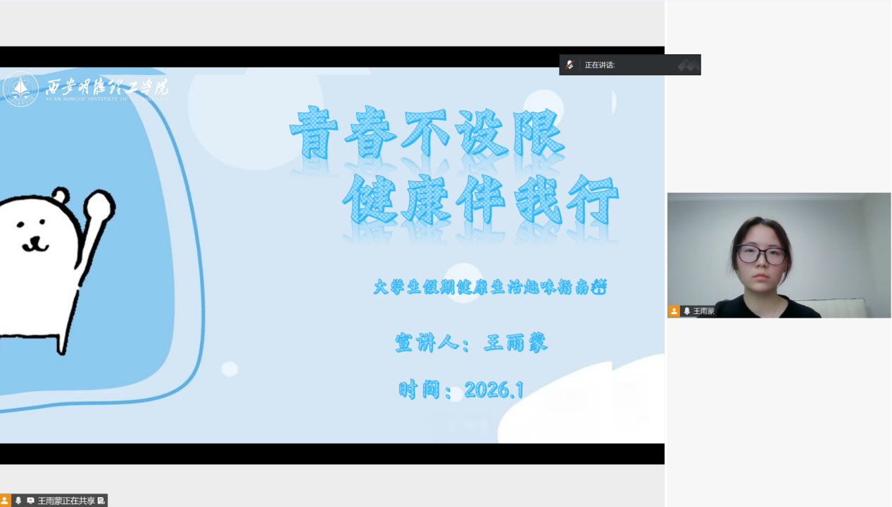活动聚焦青年学子身心健康核心需求,内容结合假期生活,设计兼具实用性与趣味性。在专业分享环节,宣讲人王雨蒙围绕健康常识、心理压力调适、科学膳食搭配、高效运动方法等关键议题,以生动易懂的语言解析专业知识,针对假期生活中常见的作息紊乱、情绪焦虑等问题提供切实可行的建议。互动环节设置了健康知识问答,同学们踊跃参与、积极互动,在轻松氛围中巩固健康认知,掌握实用技能。