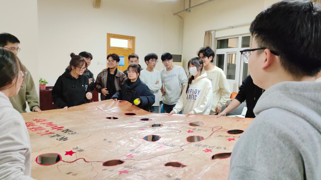 随后,孙一辰带领全体党员开展“重走长征路”游戏。团队分三组比拼,队员们通过调整地图画布的高低倾斜幅度,推动代表中央红军的网球从起点瑞金出发,沿着红军长征路线前进,以最快的时间到达延安会师。通过模拟长征路线,寓教于乐,让党员们在欢声笑语中走进峥嵘岁月,感悟党史,汲取奋进力量。
