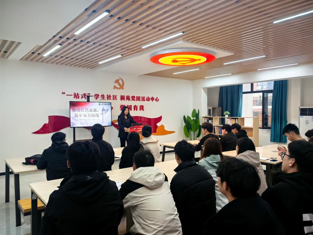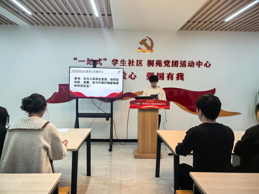 在第十一个全民国家安全教育日到来之际,为深入贯彻落实总体国家安全观,增强学生党员维护国家安全的责任感与使命感,特别是引导工科专业学生党员在科研、竞赛、实习中严守国家秘密与科技安全。4月14日,智能制造与控制技术学院学生第一党支部在桐苑党团服务中心组织开展了“赓续红色血脉,筑牢安全防线”主题党日活动。本次活动由支部书记周佳琪老师主持,支部全体学生党员参加活动。