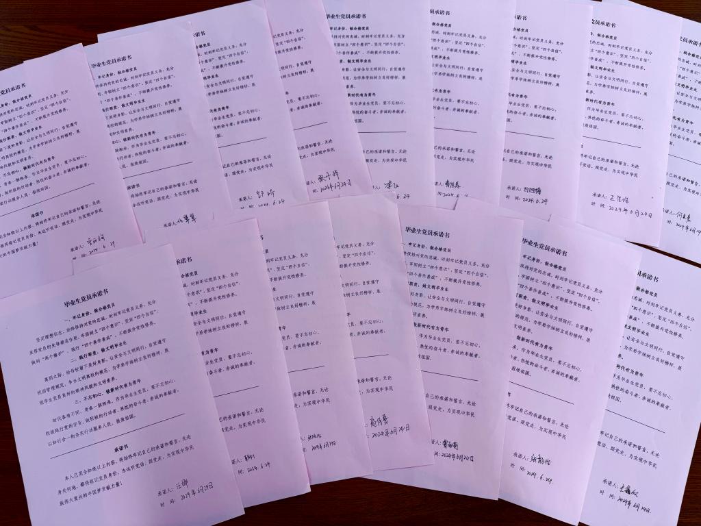 毕业生党员代表何美晨同志带领全体毕业生党员宣读了《毕业生党员承诺书》,并郑重承诺离校后,在未来的学习生活中和工作岗位上将积极履行党员应尽的义务,承担起党员的责任,发挥党员的模范带头作用,努力为党旗添彩。全体毕业生党员在承诺书上郑重签名,表达了他们坚守信仰、践行承诺的坚定决心。