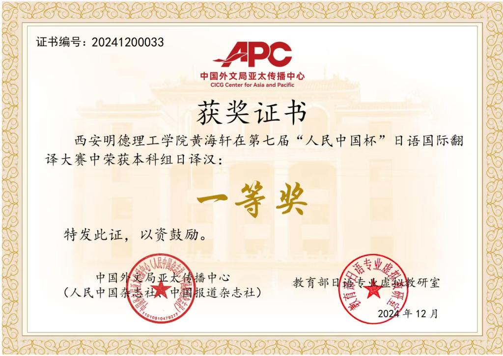 “人民中国杯”日语国际翻译大赛作为国内规模最大的日汉互译赛事,吸引了全国700多所高校万余名学生参加。在语言文化传播学院日语专业教师团队的认真指导下,共有6名同学参加了本次翻译大赛。其中,2名21级同学凭借过硬的日语基础和出色的翻译能力脱颖而出,在大赛中取得了优异成绩。
