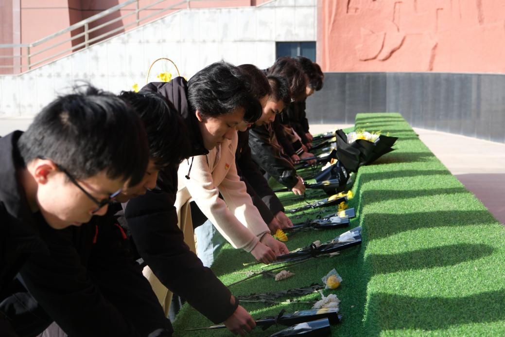全体学生党员肃穆列队,面向烈士纪念墙献花。