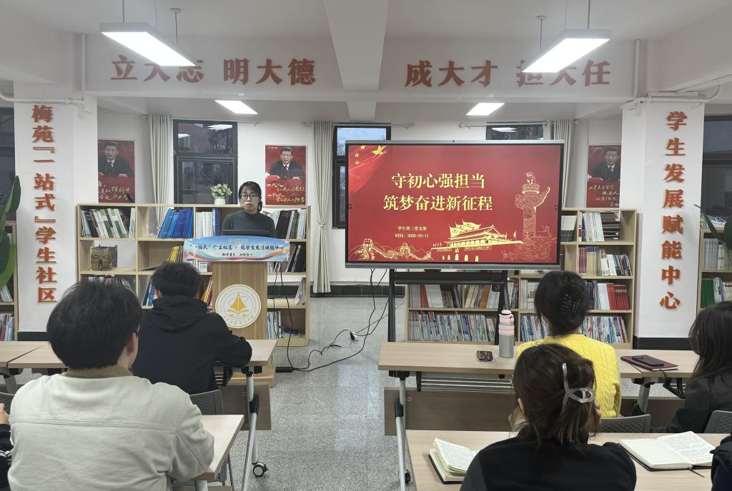 为进一步强化学生党员的初心意识与使命担当,引导党员以实干之姿奋进新征程,3月18日下午,学生第三党支部在“一站式”学生社区梅苑学生发展赋能中心开展“守初心强担当,筑梦奋进新征程”主题党课。本次党课由支部书记李娜主讲,全体党员参会学习。