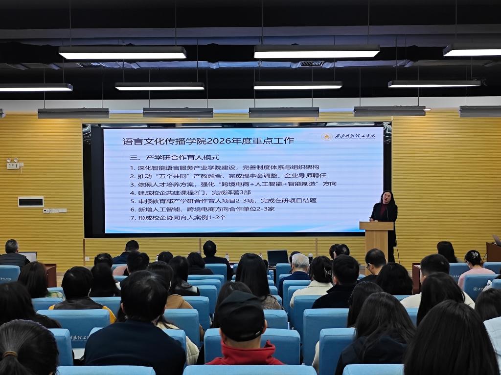 副院长刘勇作2026年学院重点工作部署,明确了迎评工作、招生宣传、产学研合作育人、制度建设、教育教学、青年教师培养培训、教学办公场所及实验室设施使用、文化墙建设等8项重点工作。