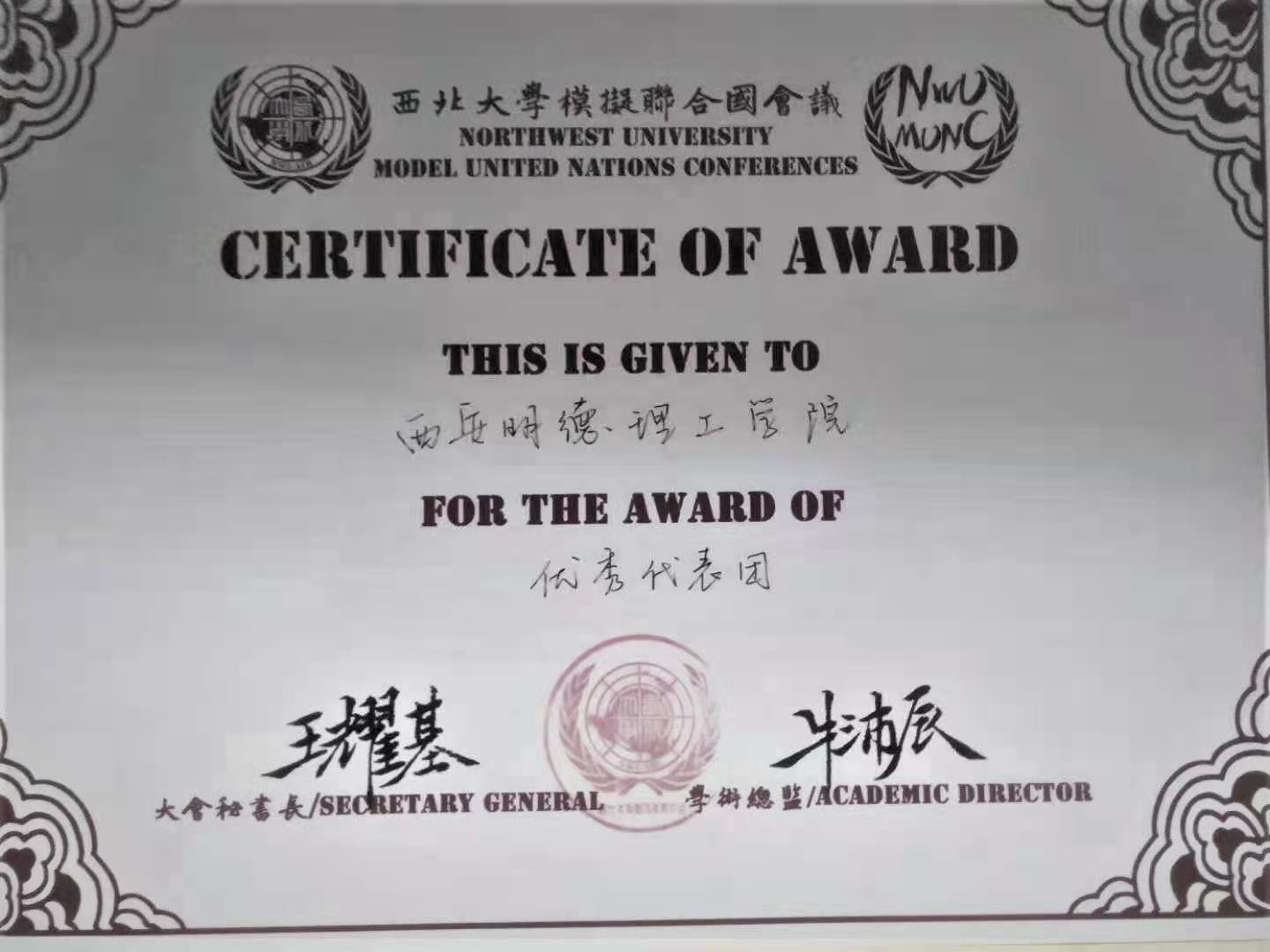 2020年12月4日至6日,我校模拟联合国团队共派6名代表和3名观察员参加西北大学第八届冬季模拟联合国大会,表现出色,荣获优秀代表团奖一项,个人最佳贡献奖(Contribution Award)一项。