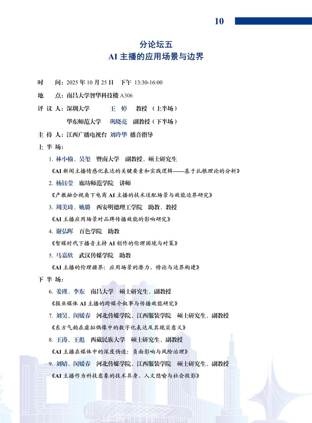 2025年10月24日至25日,第九届中国主持传播论坛在南昌大学成功举办。本次论坛由南昌大学新闻与传播学院、中国人民大学新闻学院联合主办,中国人民大学新闻学院视听传播研究中心、中国银河证券投资者教育基地协办,以“赋能与进化:人工智能时代的主持传播”为核心主题,汇聚全国主持传播领域学界专家、业界精英及青年学者,围绕智媒技术变革下主持传播的话语创新、AI主播应用边界、专业教育转型等关键议题展开深度研讨,为行业高质量发展与人才培养谋划新思路。西安明德理工学院艺术与设计学院播音与主持艺术专业积极参与论坛核心环节,其中播音与主持艺术专业姚璐教授、周美琦教师受邀参会并分享研究成果,为数智时代主持传播发展贡献明德力量。