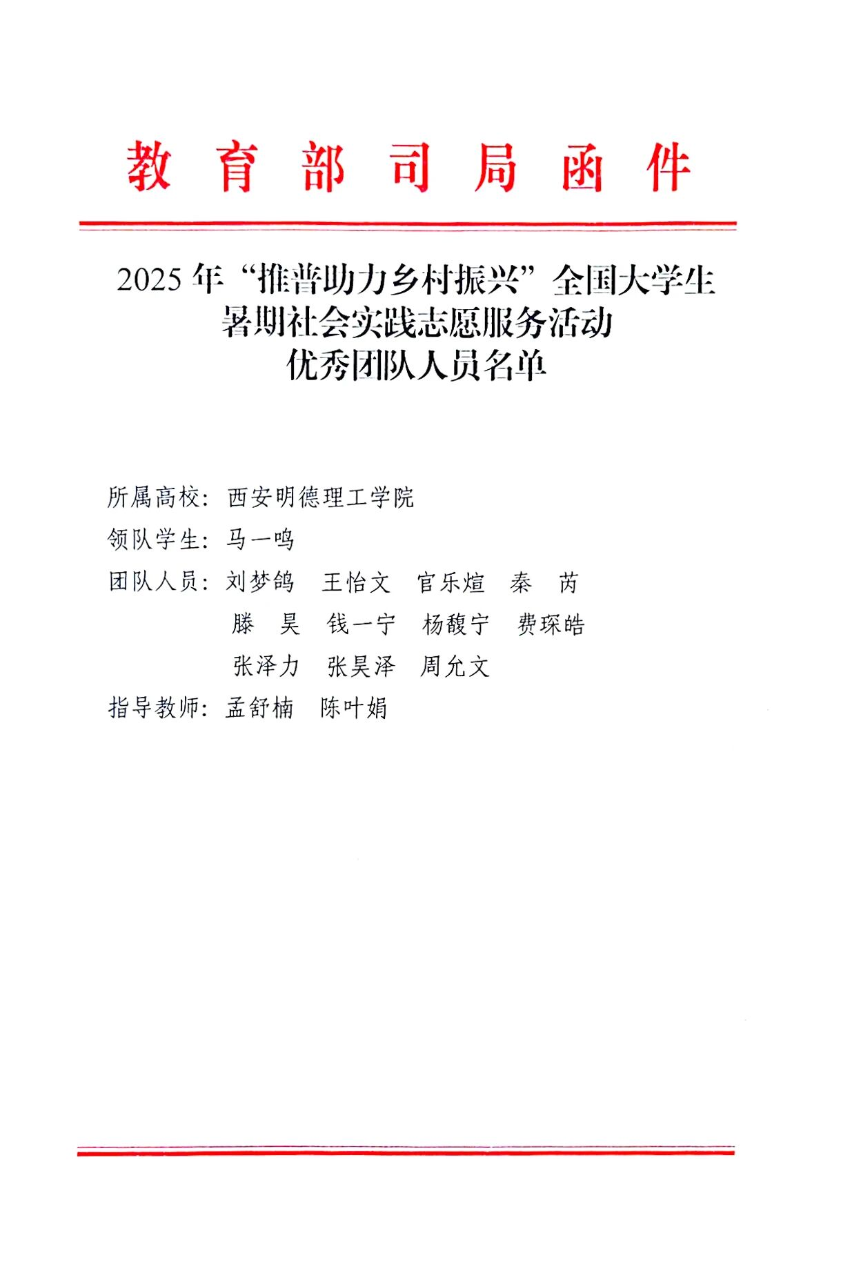 近日,教育部语言文字应用管理司与共青团中央青年发展部联合公布2025年“推普助力乡村振兴”全国大学生暑期社会实践志愿服务活动评优结果,西安明德理工学院艺术与设计学院“心相通·语先行”推普助力乡村振兴暑期社会实践队凭借创新实践、扎实成效,从全国2000支参评团队中脱颖而出,荣获全国“优秀团队”称号,获主办单位联合表扬,彰显学校以专业赋能乡村振兴、以实践培育时代新人的显著成效。