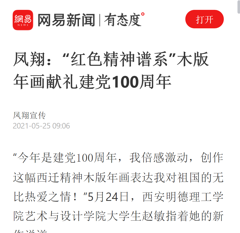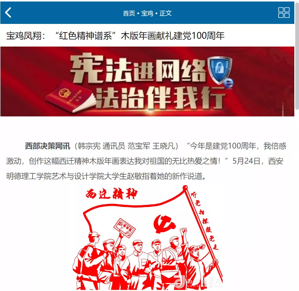 为庆祝中国共产党百年华诞,我校师生以凤翔木版年画的风格,设计纂刻出了20余个精神谱系,以这种形式集中展示中国共产党百年历程中形成的伟大精神,取得的伟大成就,让师生在实践中感受中国共产党的精神伟力。我校师生创作的“红色精神谱系”木版年画受到了人民日报客户端、陕西日报客户端、西安发布、阳光网、网易新闻、宝鸡电视台、宝鸡日报、《新西部》杂志等媒体的广泛报道。