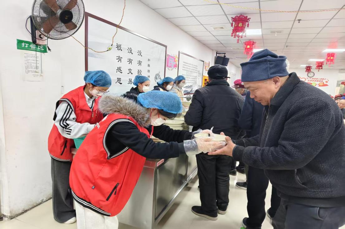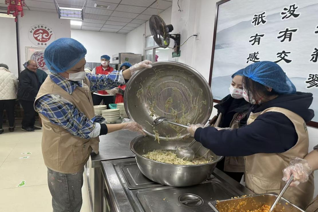 活动当天,志愿者们准时抵达服务点,迅速投入各项准备工作。大家分工协作、配合默契,有的协助厨房工作人员精细切菜,认真处理每一份食材;有的负责整理餐具、清洁场地,为老人营造整洁舒适的就餐环境;还有的在就餐区域维持秩序,主动搀扶行动不便的老人就座,耐心引导大家有序取餐。午餐制作完成后,志愿者们化身“暖心服务员”,为老人们精准打饭,细心叮嘱老人慢吃慢用,贴心关注每一位老人的用餐需求。