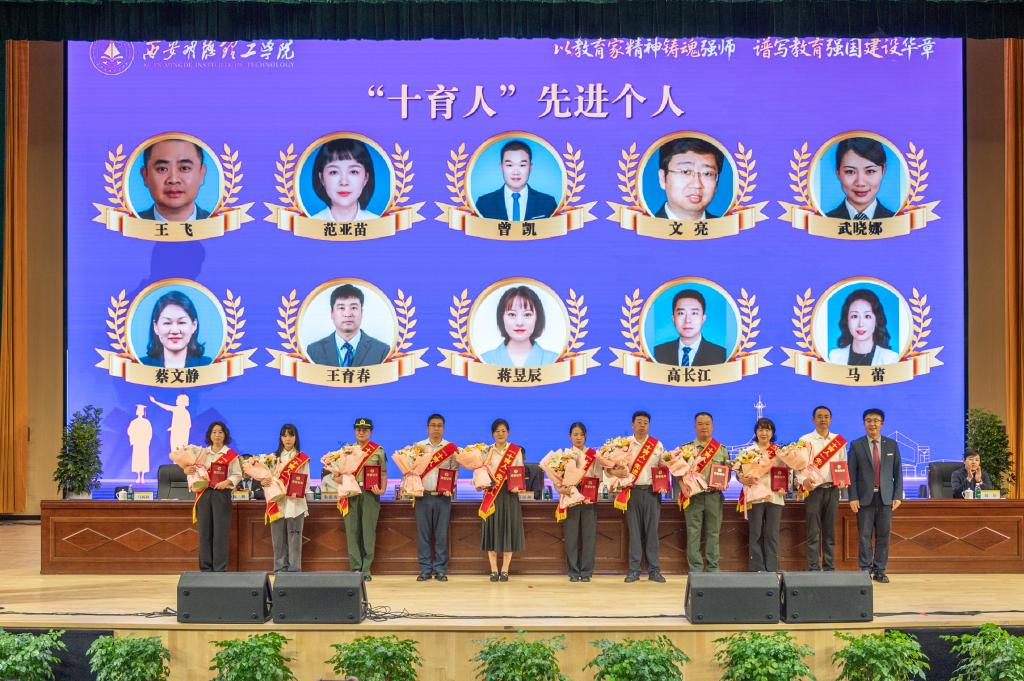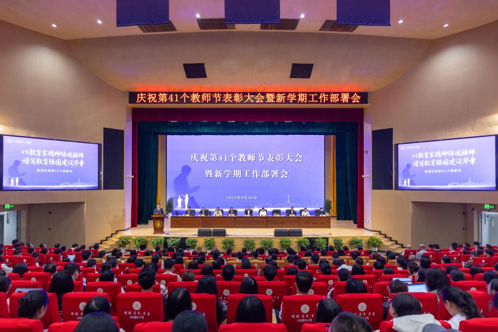 在第41个教师节来临之际,他代表学校领导班子,向全校教职员工以及受表彰的集体和个人表示亲切问候、衷心祝贺和崇高敬意!王校长对学校上半年及暑期工作成效做了简要回顾,提出了新学期工作的指导思想和主要思路。他强调,下半年工作要以“五个着力”作为重点工作任务:一是着力提升党建和思政工作水平,引领推动学校高质量发展;二是着力评建整改和评估达标建设,坚决打赢评建攻坚战;三是着力强化学生思政教育工作和就业工作,构建高质量学生思政教育与管理服务工作体系;四是着力转变教育思想观念,扎实做好“十五五”规划研制工作;五是着力抓好校园安全稳定工作,夯实学校高质量发展根基。王校长结合教学评建工作,提出了聚焦评建整改工作,聚焦数据核查工作,聚焦重点工作,聚焦特色建设和亮点打造,聚焦评建氛围营造等“五个聚焦”的主要任务。并就如何做好新学期工作,高质量完成评建目标任务,强调了四点要求:一是要强化责任担当抓落实;二是要把握内涵要求抓落实;三是要形成工作合力抓落实;四是要强化统筹推进抓落实。希望全校教职工继续保持旺盛工作热情和饱满工作干劲,以更高标准、更优质量和更大成效,坚决打赢教学评建攻坚战,为明年顺利通过教育部评估奠定坚实基础。