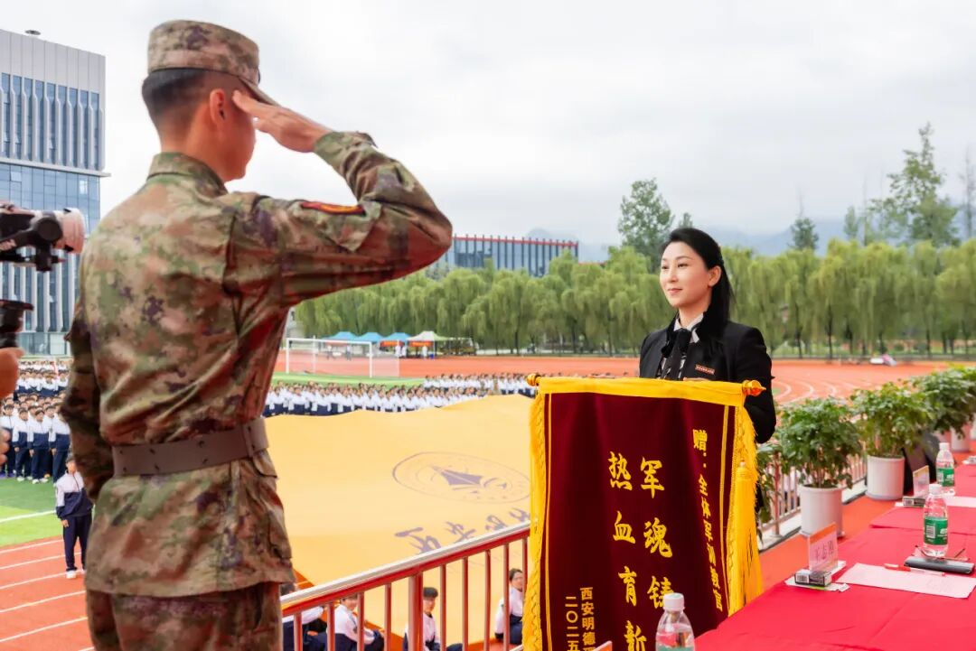 明德源教育集团常务副总裁、西安明德理工学院副董事长、执行董事张琳向全体军训教官赠送锦旗。