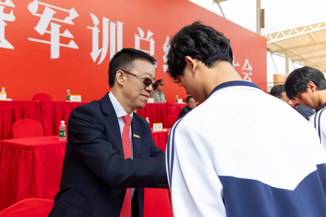 袁汉源董事长代表金叶科教集团、明德源教育集团和学校董事会向全体2025级新生表示热烈欢迎,并向圆满完成军训任务的同学们表示祝贺,向全体承训教官和老师们致以崇高敬意和衷心感谢。他结合“九一八”事变94周年的特殊时刻,勉励同学们铭记历史、奋发图强,担当时代之责,并对同学们在秋雨绵绵中坚持训练的热情与斗志给予高度赞扬。他还回顾了学校26年“实业报国、文化兴邦”的办学初心与科技自强之路。强调学校当前迎接本科教学合格评估的关键任务,号召全体新同学积极参与评建实践活动,以青春担当助力学校发展。最后他循着“明德、亲民、至善”的校训精神,向新生分享三句成长箴言:一要明德于心,立根铸魂,涵养“苟利国家生死以”的家国情怀;二要亲民于行,砥砺锋芒,淬炼“板凳要坐十年冷”的工匠精神;三要至善于业,勇毅前行,永葆“长风破浪会有时”的奋进姿态。
