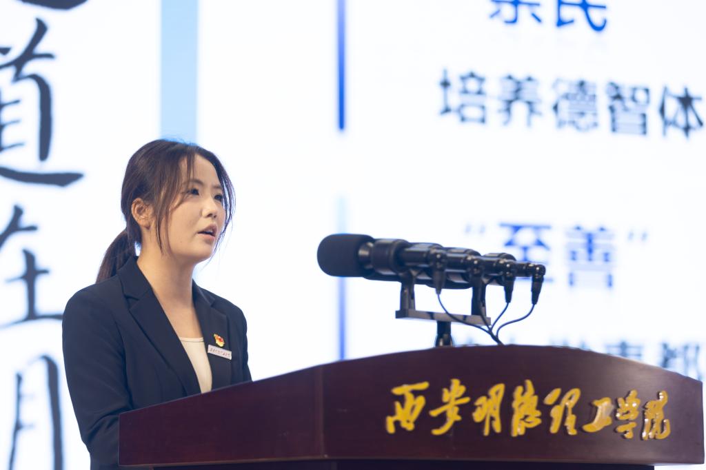 经济与管理学院王雨蒙同学以《以评促建强内涵,特色发展创一流,全面迎接本科教学工作合格评估》为题作示范宣讲,从学校底蕴、评估认知、成长获得感、青年使命四个维度,生动诠释了“明德、亲民、至善”校训与评估工作的深度融合,引发全场共鸣,充分展现了宣讲团成员的良好素质。